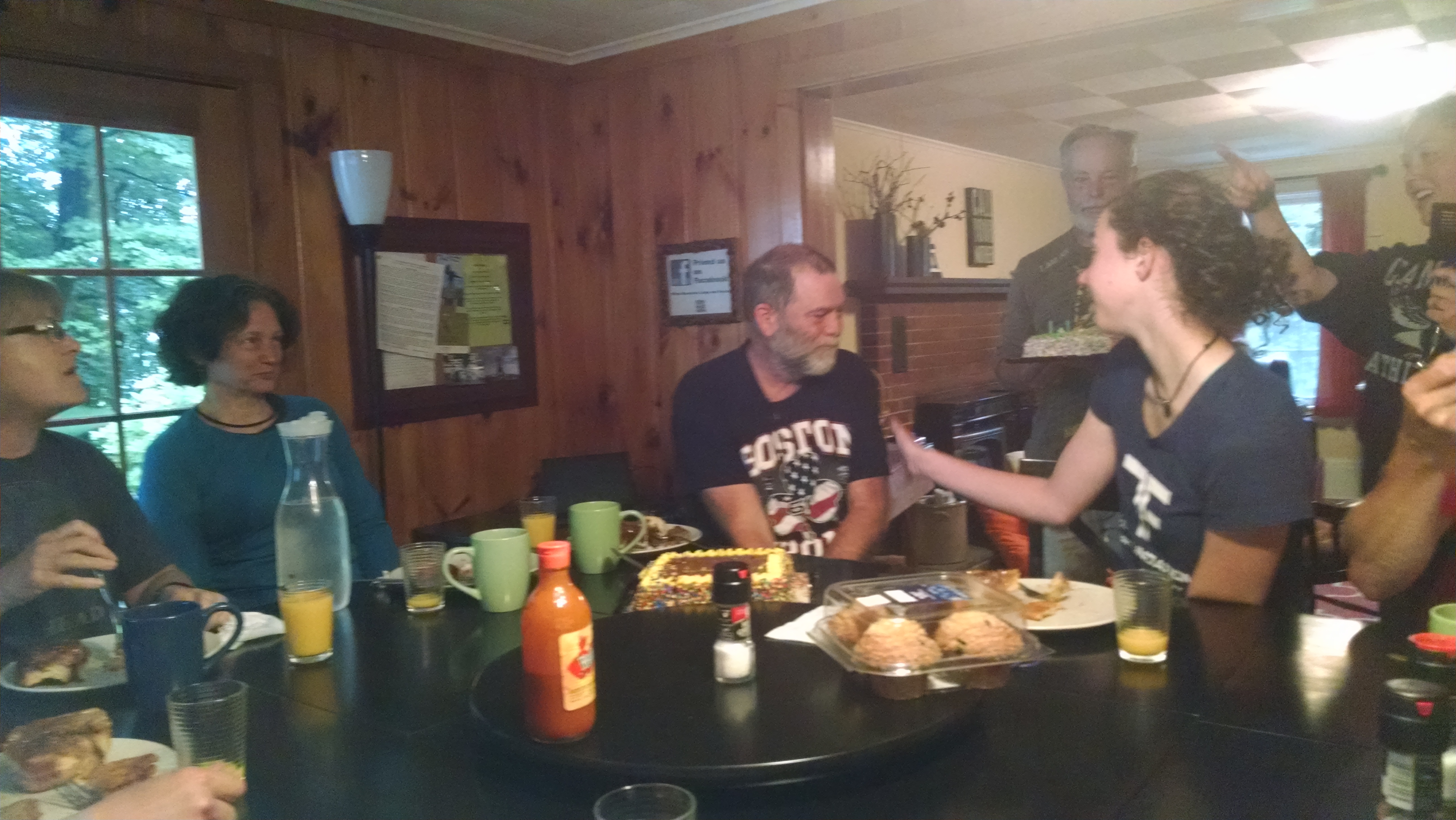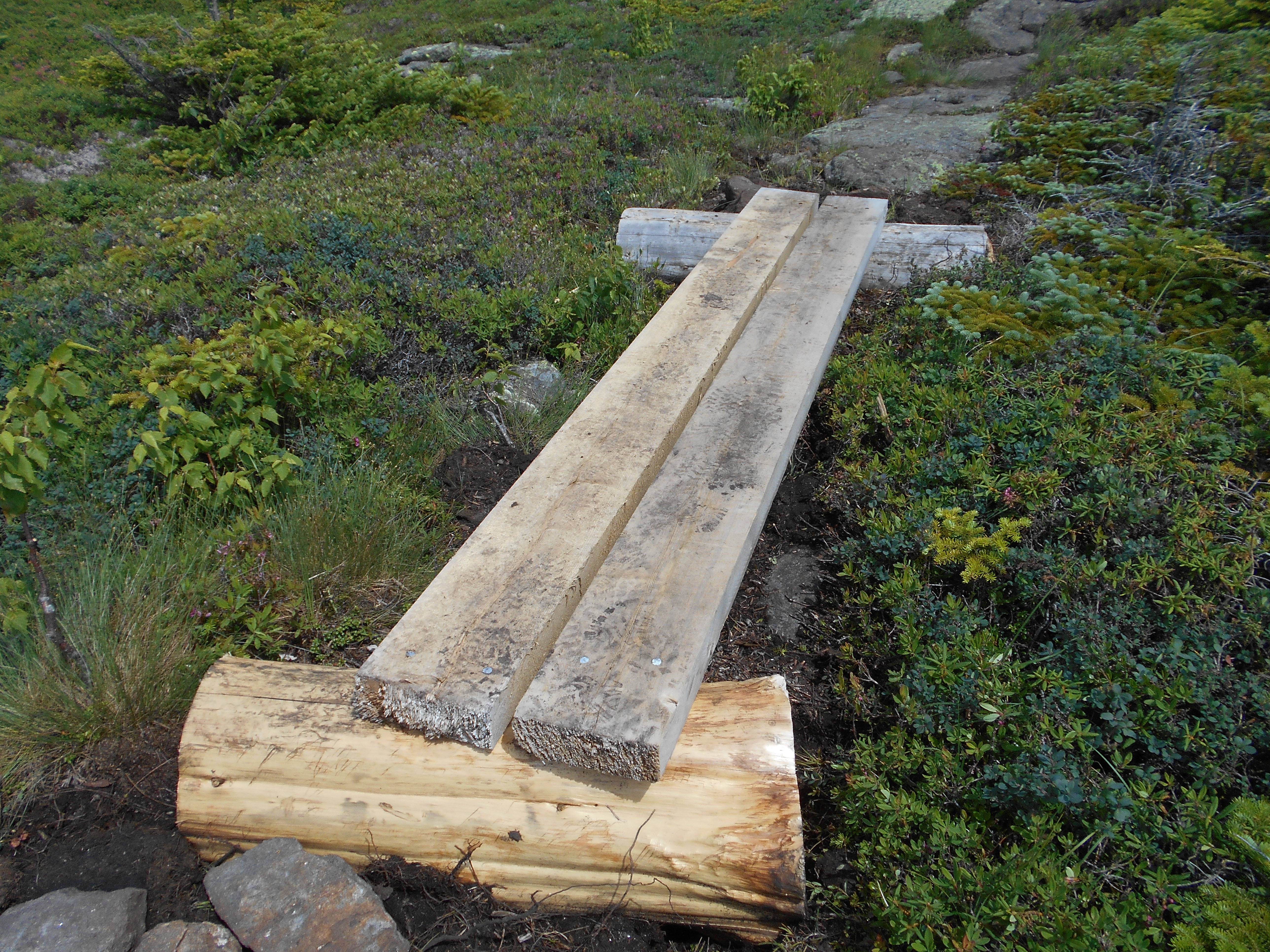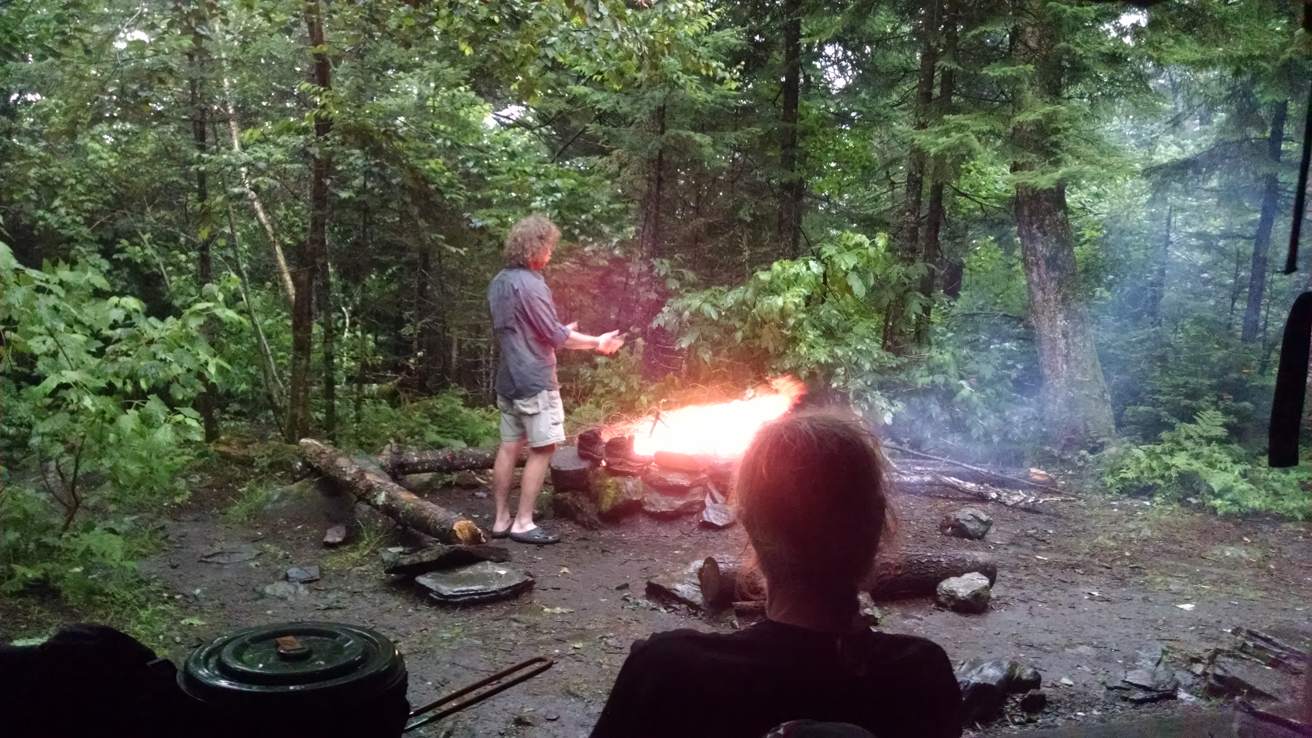 day started out rainy. walked to the general store for breakfast at 6am then back at the hostel for a 7am shuttle to the road. just a very light rain in the morning so good hiking w/o raingear. hike up old blue a little harder and longer than expected, with no views due to fog. other than typical maine rocks, roots and bogs, hike was uneventful until late afternoon. kept hearing thunder but so far only a few drops. also ran into a trail crew working on new steps and I thaked them for their work...I realy think hiking the trail is MUCH easier than building it...so we owe trailcrews a lot! now just relaxing before cooking dinner.